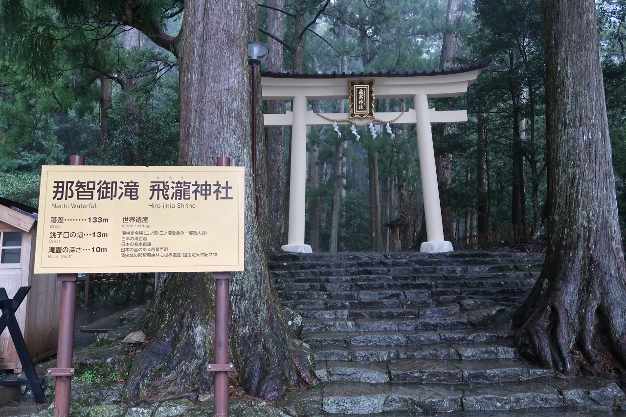 滝と一緒に写真を撮りたくて、土砂降りの雨の中、必死で石段を登って行きましたが、周りがガスっていて、なかなかいいショットが撮れませんでした。この塔は300円を払うとエレベーターで3階に上がることができました。