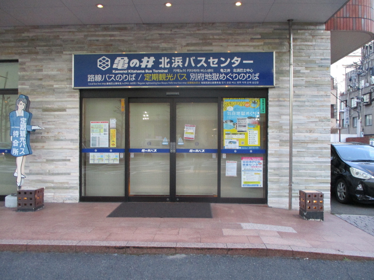 大分空港や博多天神などヘ行くバスがトキハというデパートの前から出ていますが、ちょうどその向かいあたりにありました。バスガイドさんが案内してくれる地獄めぐり定期観光バスは別府駅前からだけでなくここからも乗車できました。