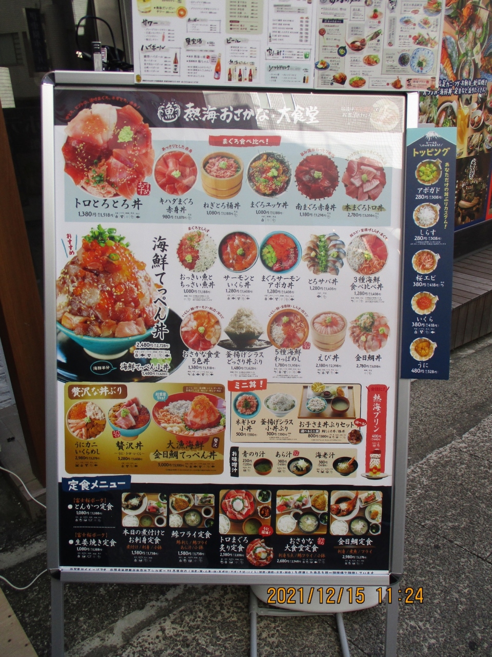 コロナ禍とは思えない。熱海は元気でした。こちらは11月30日にオープンしたばかり。ランチタイムに立ち寄ったのですが、丼ものの種類が多くてコスパの良いものから、熱海ならではの金目のてっぺん丼5,500円などもありました。