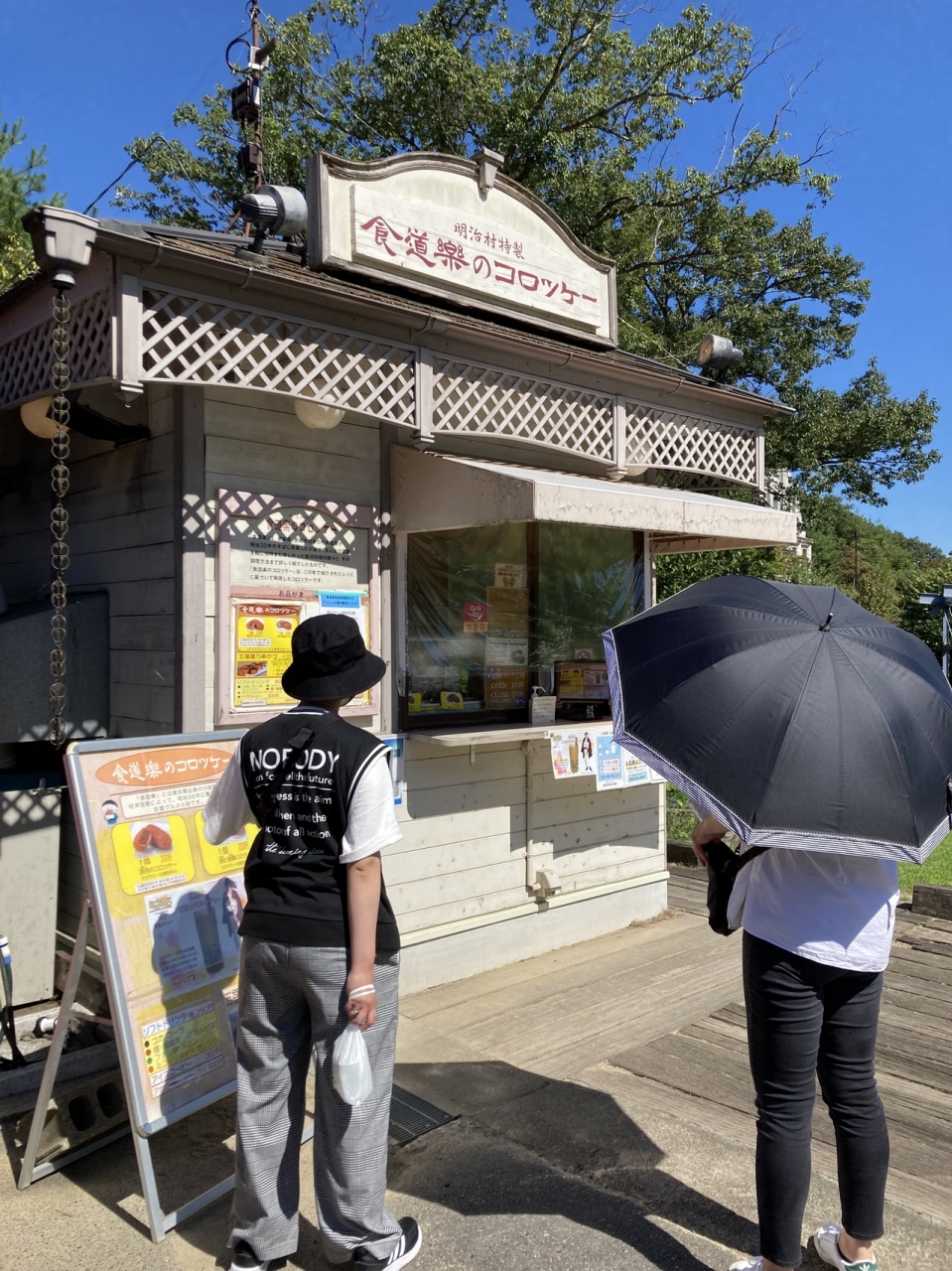 明治時代の味を再現したコロッケで、名鉄の「明治村時間旅行きっぷ」を購入すれば、「時間旅行クーポン」を利用して、こちらのお店のコロッケー2個とソフトドリンクのセットをいただくことができます。ただこの日はこのお店の周りはとても暑かったです。