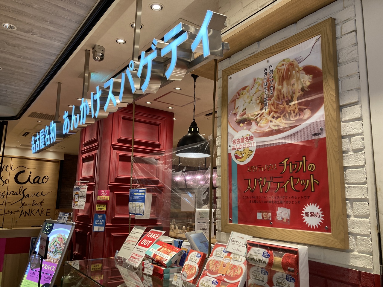 全国でも有名な「名古屋めし」の代表格ということで、店頭にも「名古屋名物あんかけスパゲティ」という大きな看板が出ていてすぐわかりました。JR名古屋駅の改札からうまいもん通りに入って数分のところにありました。