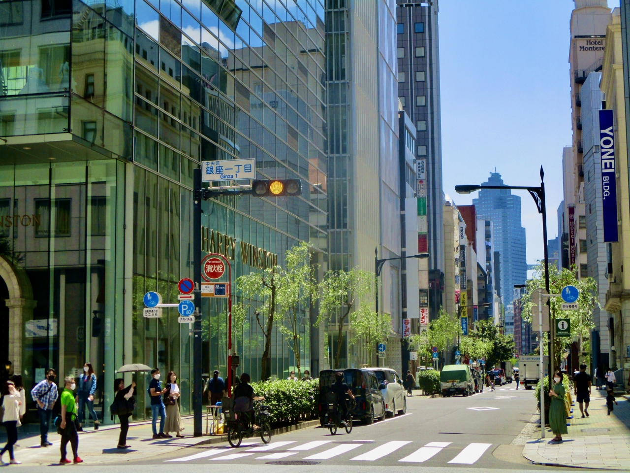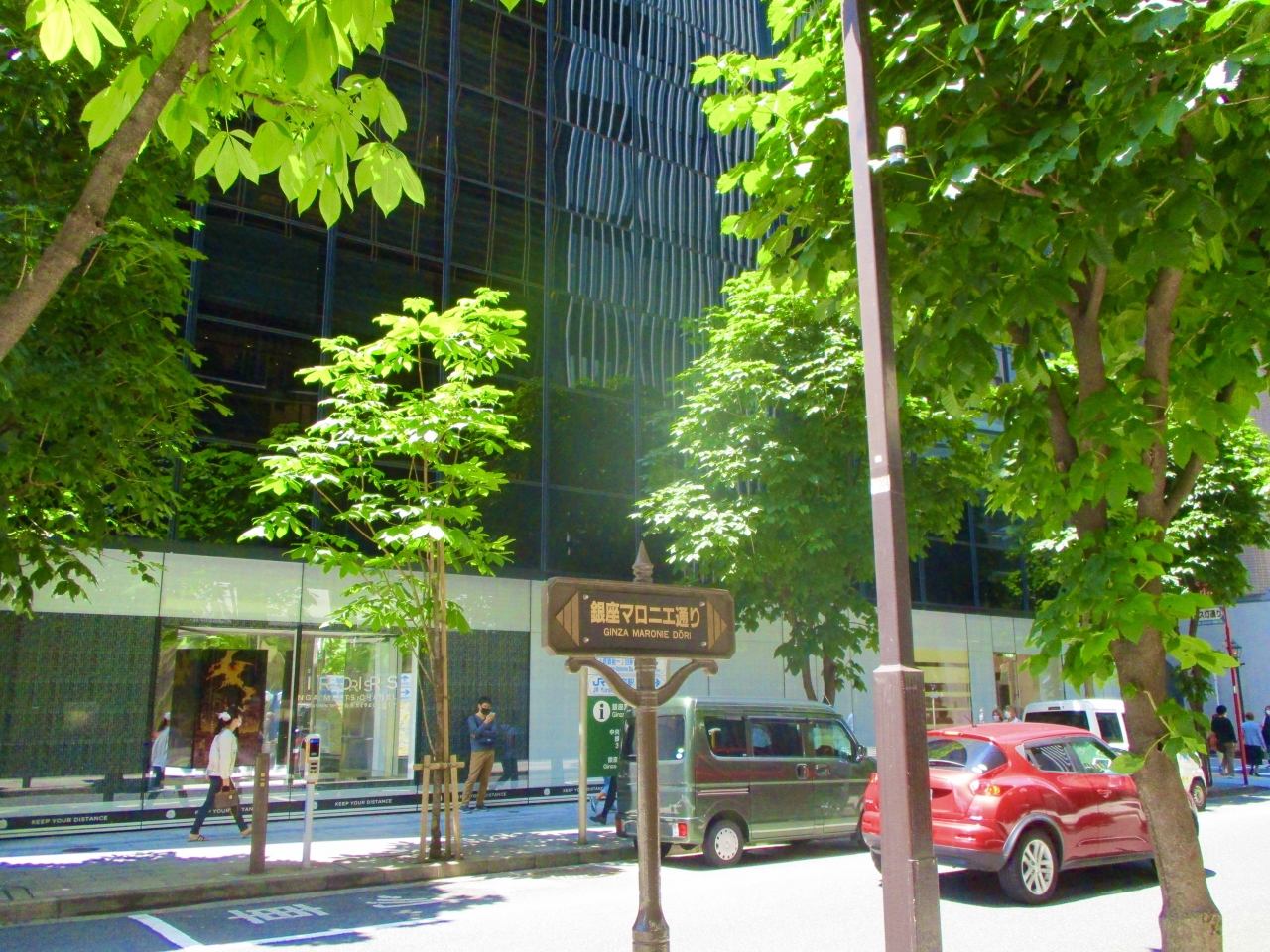 銀座二丁目を歩いていたら、見つけました。マロニエゲートから銀座二丁目交差点を抜けてさらに東に続く通りです。この通りの街路樹はマロニエの木で、シャネル、ミキモト、バーバリーなど高級ブランドのお店が沢山並んでいます。