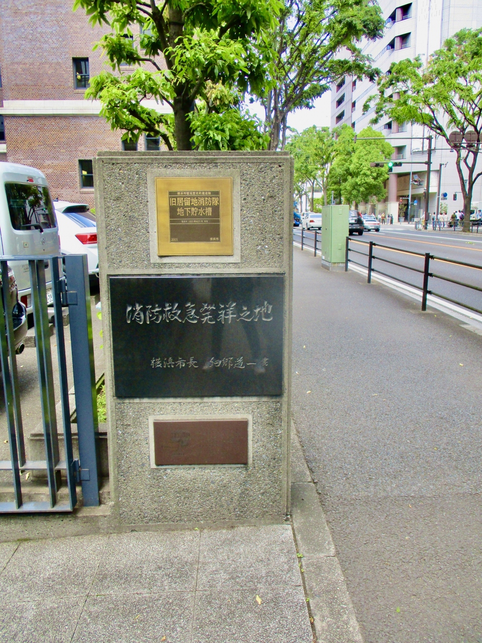 日本大通りを歩いていて、たまたま見つけたのですが、ここにある解説版を読むことにより、明治時代にこの地に居留地消防隊があったことを知りました。レンガ造りの防火用の水槽は当時の様子を知る数少ない遺構だそうです。