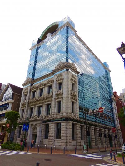 馬車道を歩いていたら、一際目立つ建物があり、これが損保ジャパンの建物でした。旧川崎銀行の横浜支店だった建物で、ネオルネッサンス建築に、青いミラーガラスを増築したもので、神奈川県立歴史博物館の近くです。