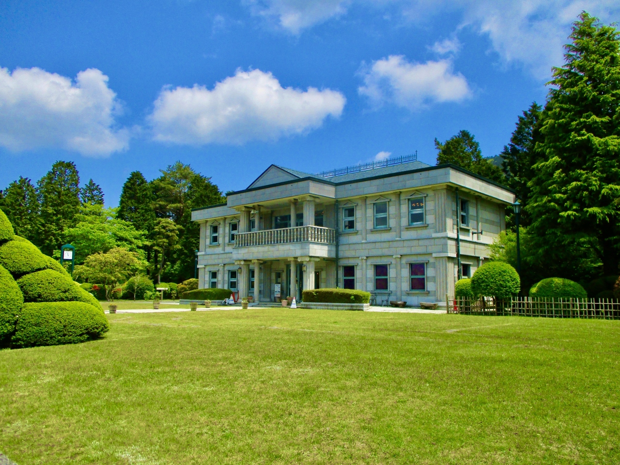 最近あちこちで洋館巡りをしているので、どんなものかと、暑さの中、階段を上って、湖畔展望館とも呼ばれる白御影石張りの二階建ての洋館を見に行ってきました。明治時代に築造された「箱根離宮」の西洋館をモチーフにしたということでした。