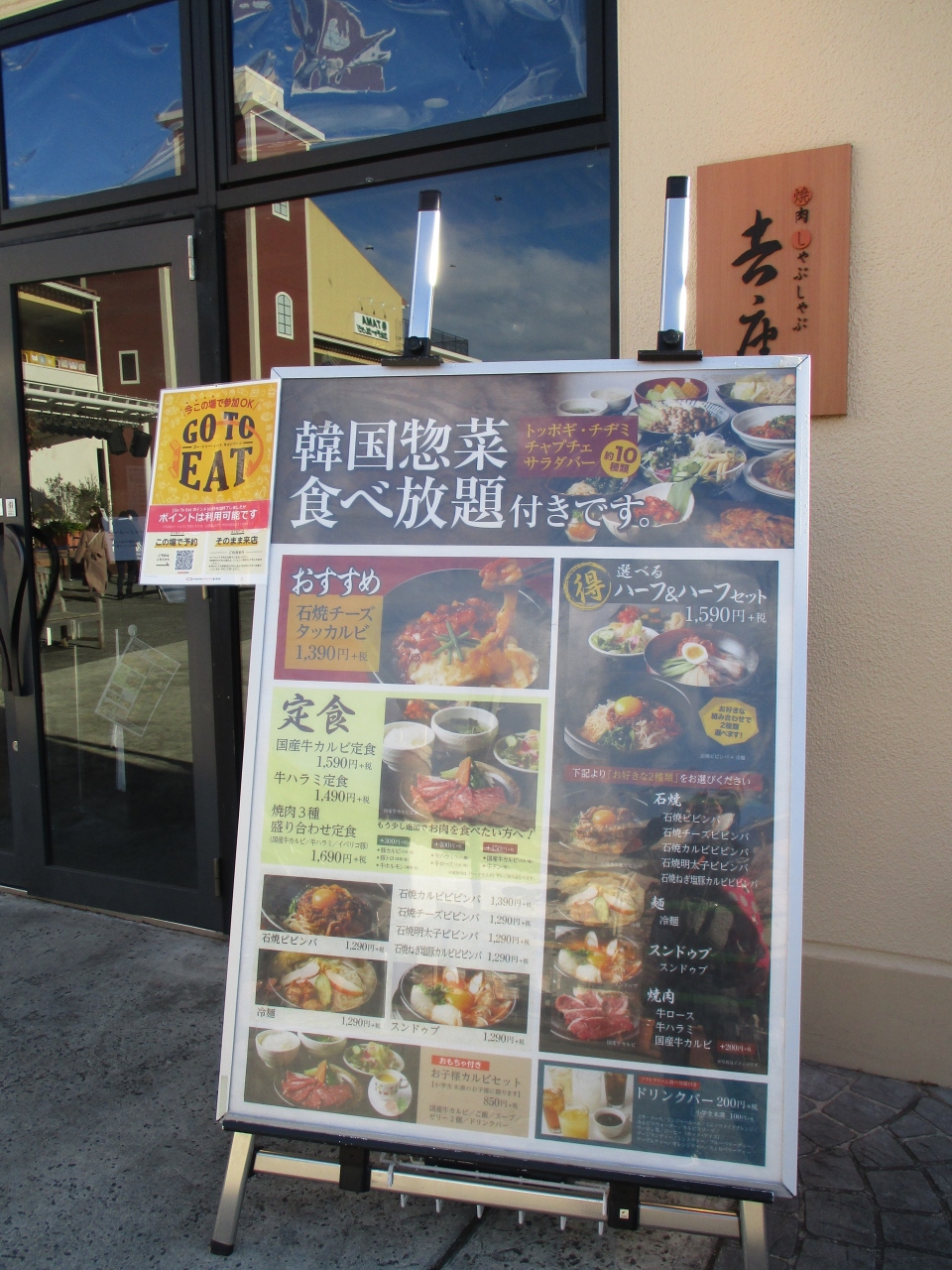 韓国惣菜食べ放題というので、立ち寄りました。焼肉などを注文すると、サラダ、キムチ、チャプチェ、トッポギ、チヂミ、わかめスープなどが自由に食べられました。ドリンクバーも別料金で付けられました。野菜をしっかり食べたい方にオススメです。