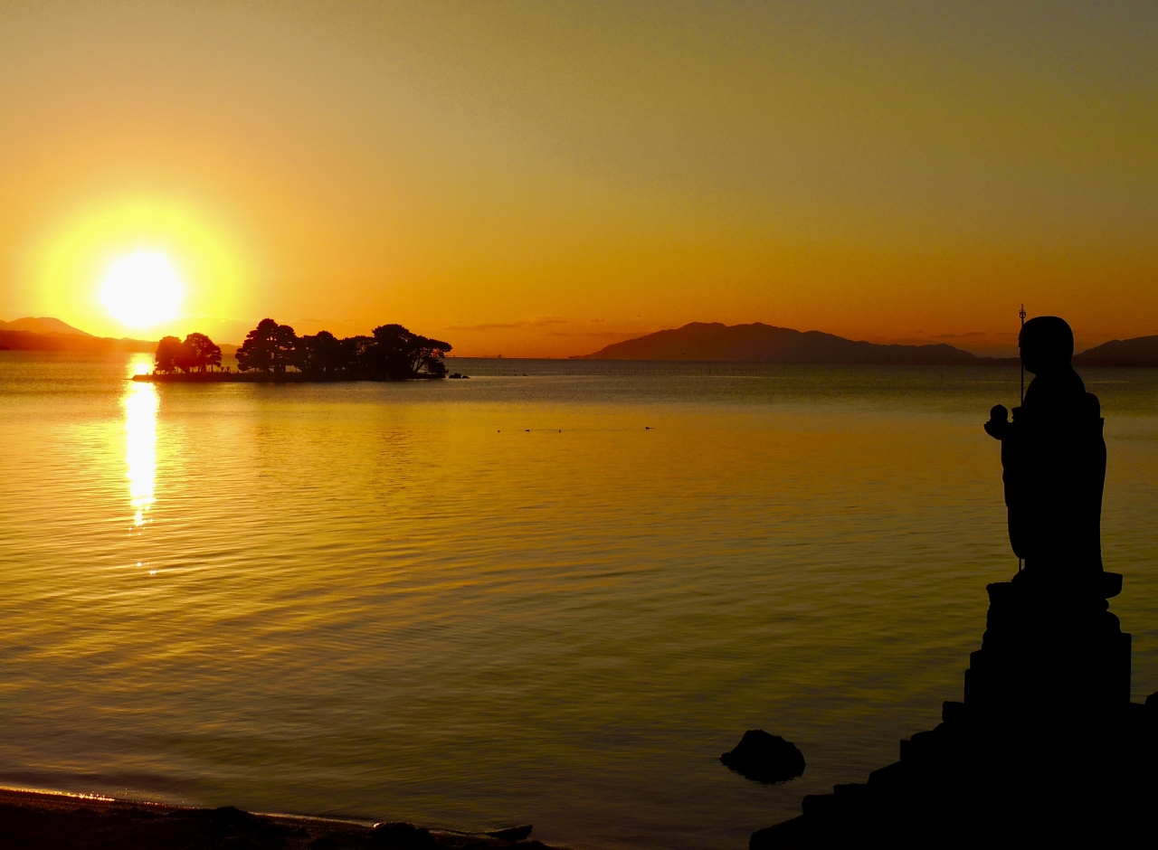 宍道湖唯一の島で、全長110メートル、幅30メートル、周囲240メートルの無人島です。島の名前が女性としては気に入らないが、この島とお地蔵様の背に沈む夕日は、想像していた以上に本当に素晴らしかったです。