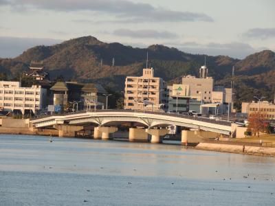 松江市内を流れる大橋川にかかる橋の中で、一番宍道湖側にかかっている橋で、宍道湖と反対側には、松江大橋がかかっています。島根県立美術館側からよく見えました。昔は有料道路だったんだそうです。ぐるっと松江レイクラインバスでも通りました。