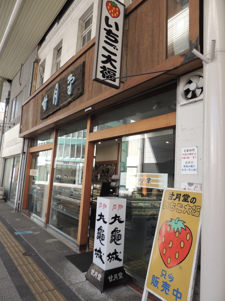 丸亀城を見学してから、あまりの暑さを避けたくて、通町商店街から、この浜町商店街の中を通って、JR丸亀駅へ戻りました。アーケードなので強い日差しを避けることができました。いちご大福が20種類もある甘月堂があります。