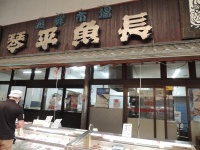 金比羅さんを観光し、JR琴平駅に向かう途中に、この商店街を見つけました。かつては賑わっただろうアーケードの中を進むと、大きな魚屋さんを見つけました。ランチ時という事もあり、地元の方が次々にやってきます。見ると魚の種類も豊富。お寿司や惣菜もあって安い。この日のランチにお寿司を購入しました。