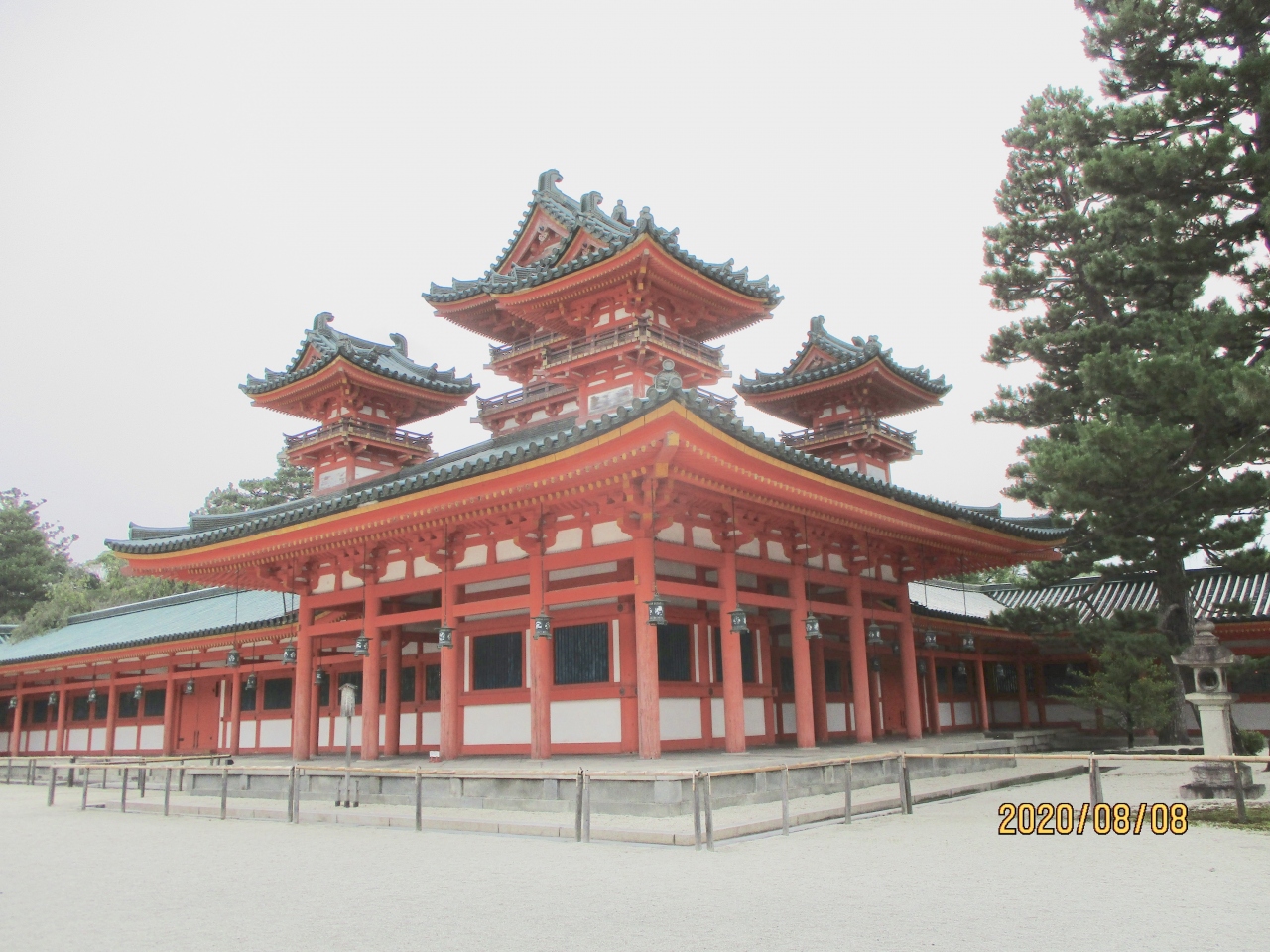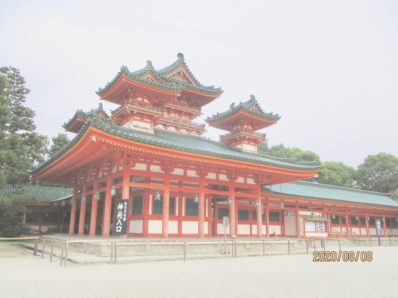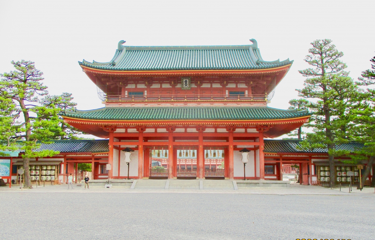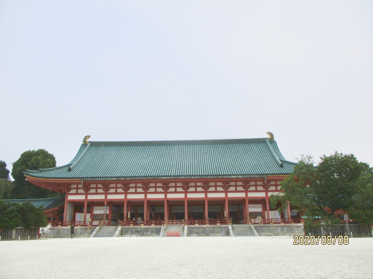 平安神宮の第二ゲートである應天門をくぐると正面に見えてきました。平安期の役所の建物を8分の5の大きさに再現したそうですが、平安期がいかに大きかったか。これでも十分大きいです。ここは外拝殿で、本殿に向かって拝むそうです。