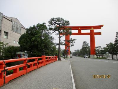 四条堀川のホテル近くから市バスに乗って、朝一番で平安神宮詣でに行きました。バス停のすぐ近くに大きな朱色の鳥居がありました。昭和3年に昭和天皇御大礼の記念に建設計画が開始され、平成14年に国の有形文化財に登録されたそうです。