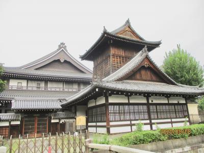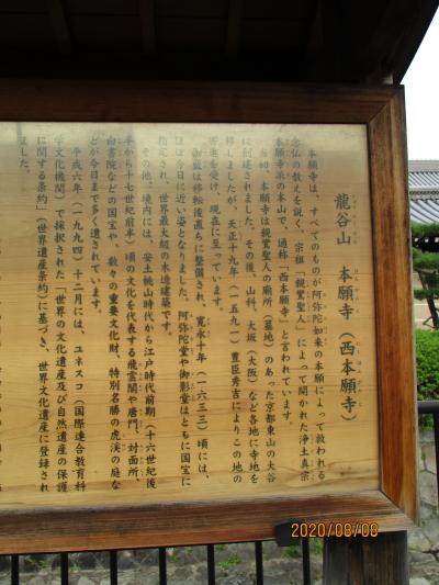 西本願寺の阿弥陀堂門も右手の方にありました。新撰組ゆかりという案内板があったので、足を止めました。内部に大きな太鼓があり、もともと太鼓を叩いて時を告げるところでしたが、一時新撰組がここを使っている時期があったようです。