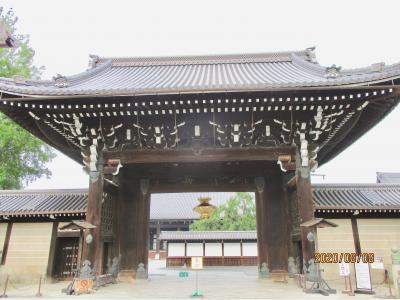 たまたま宿泊ホテルが堀川通に面していたので、バスですぐでした。境内には東急ホテル側に、宿泊や研修に使われる会館や集会所、広い駐車場などもあり、お寺の規模は想像以上に大きかったです。阿弥陀堂は内陣の修復工事中でした。