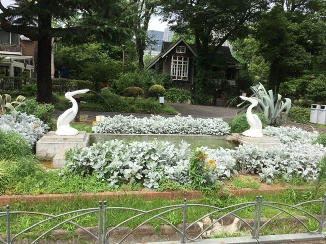 地下鉄日比谷駅A 10出入り口から日比谷見附跡、心字池と進むと、その先右にはフェリーチェガーデンがあり、左手には、このペリカン噴水と第一花壇があります。噴水は小さな噴水ですが、ベンチも沢山あるので、噴水とお花と緑を観ながら、のんびりできます。