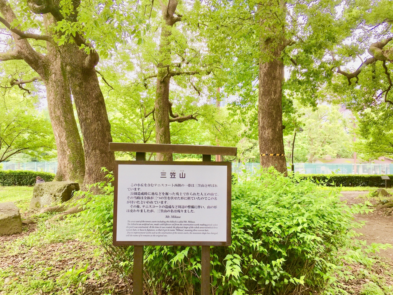 コロナの自粛太り対策で、今日は日比谷公園の中を隅から隅まで歩くぞと目標を決め、普段は決して行かないテニスコートの裏側を歩いていて見つけました。名前は三笠山。三笠山というと私はすぐどら焼きを思い浮かべますが、もともと日比谷公園造成時の池を掘った際の残土を積んで造った山が三つあったからだそうです。現在ではその二つあったところがテニスコートになっていて、山は一つだけです。