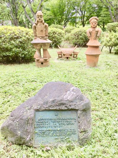日比谷公園の中をお散歩していて見つけました。場所は首賭けイチョウの近くでした。案内板によると東京都立日比谷公園と宮崎県立平和台公園が姉妹公園になった記念として、宮崎県から東京都に寄贈されたもので、二体の人物埴輪と家形埴輪です。日比谷公園てこのような色々な楽しみがあるから大好きです。