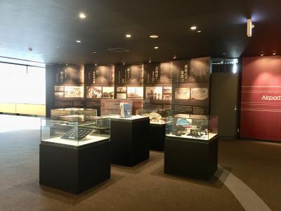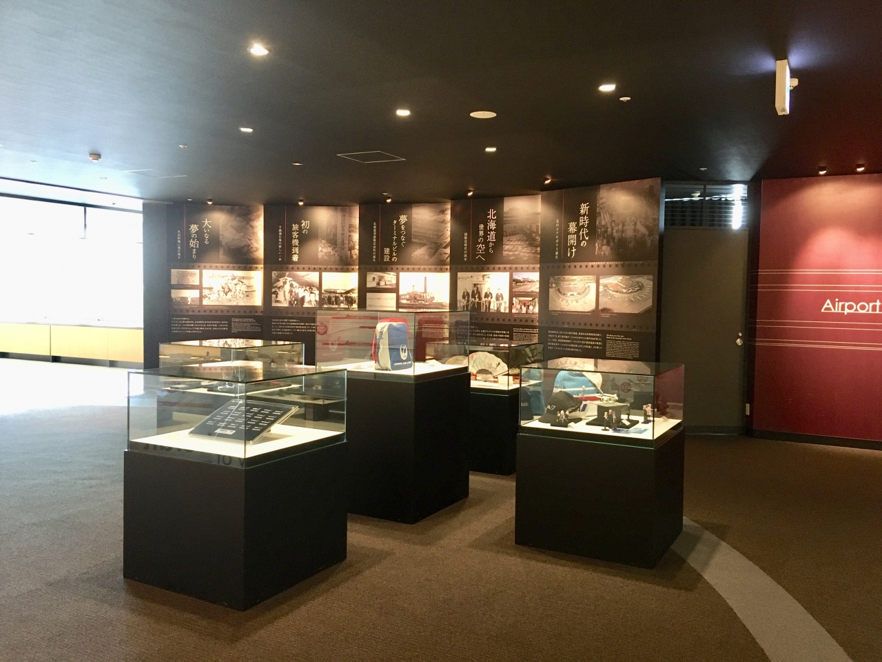 3階のラウンジに行く手前にあったので、ちょっとのぞいてみました。新千歳空港の歴史を紹介するヒストリーゾーンやジャルなどの昔の制服などを展示するギャリーゾーン、歴代の飛行機の模型などを展示するシンボルゾーンがあり、鶴丸印の青いショルダーバッグもありました。私も昔持っていたように思います。