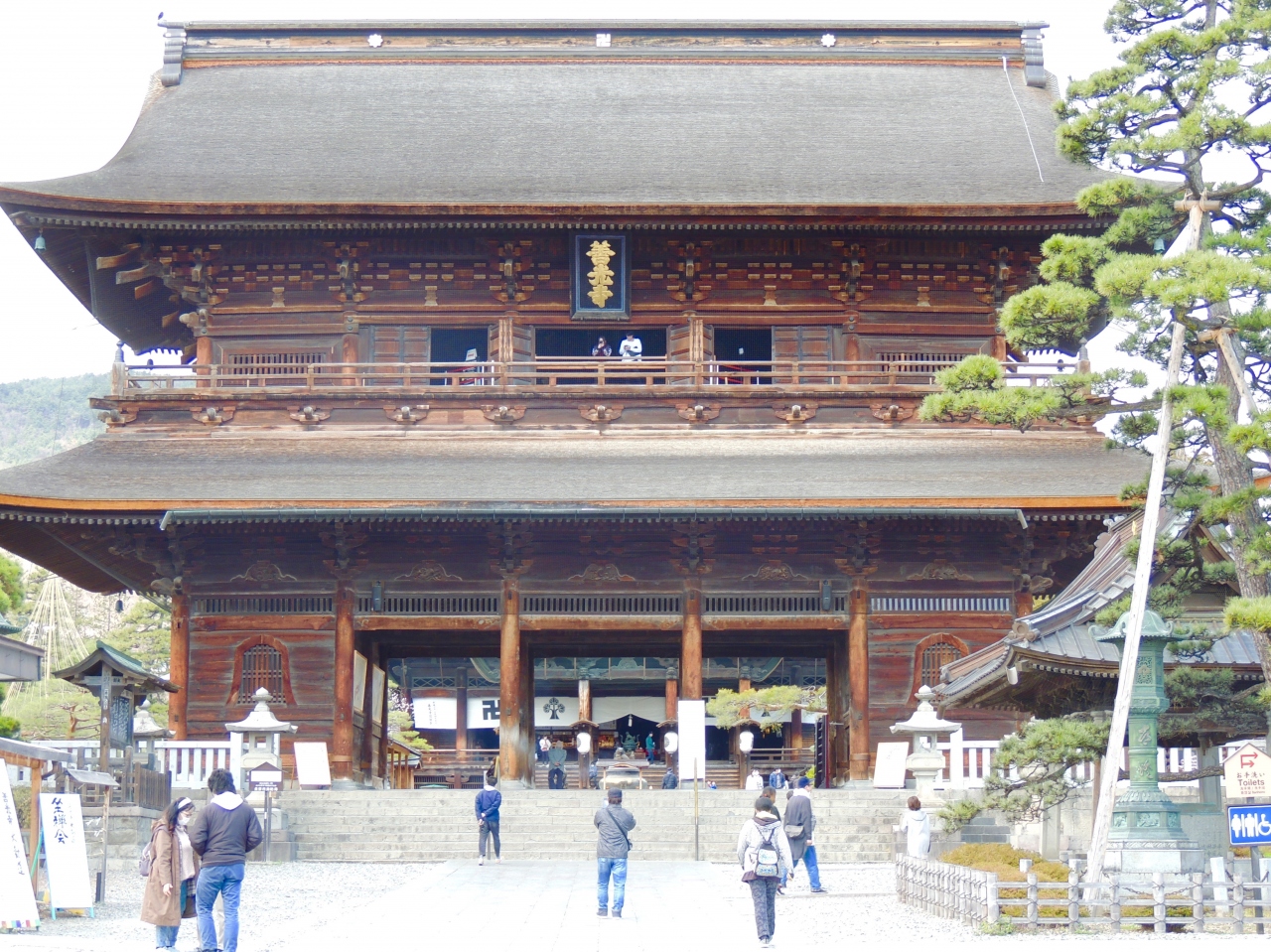 江戸時代中期に建立された本堂の手前の二階二重門で、国の重要文化財に指定されています。平成の大修理で屋根も建立当初の栩葺きに復元され、二階に登楼参拝することができます。山門にある善光寺という額が鳩字の額として有名です。