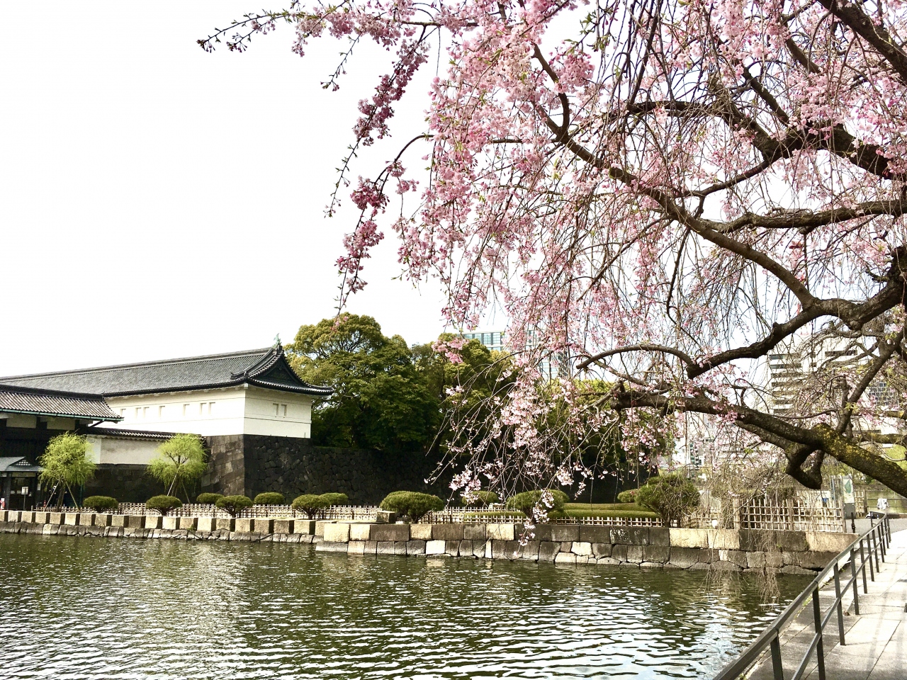 元は江戸城の正門であった大手門ですが、現在は皇居東御苑の入り口になっているので、観光客が多い橋です。橋のそばにシダレ桜が3本あり、いつもこの桜と橋の風景を見るのを楽しみにしています。向かいにはパレスホテルがあり、結婚式の記念写真の撮影が行われていました。