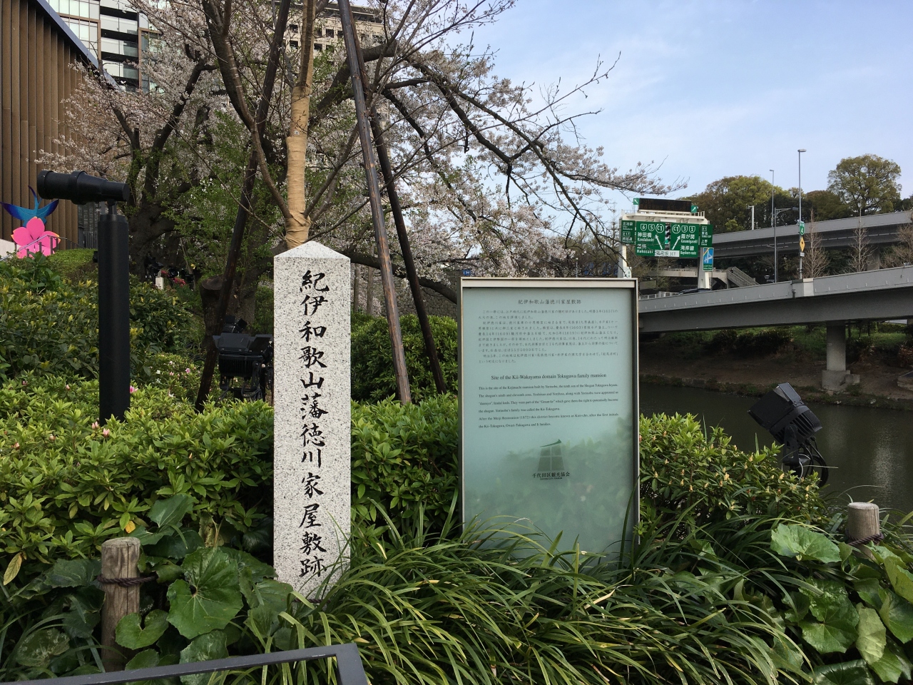赤坂弁慶堀沿い、以前は赤坂プリンスだったところ、現在は紀尾井町ガーデンテラスとしてすっかり新しくなった一帯は、江戸時代は徳川御三家の一つの紀州徳川家の上屋敷だったところです。弁慶橋の手前に案内板が立っていました。