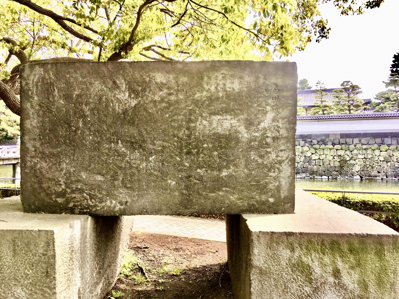 江戸城を最初に築いたのは家康ではなく、扇谷上杉氏上杉持朝の家臣、室町時代の武将である太田道灌でした。家康が江戸に移るなんと130年も前なんです。平川門の平川門橋の近くにこの道灌を偲ぶ石碑がありました。