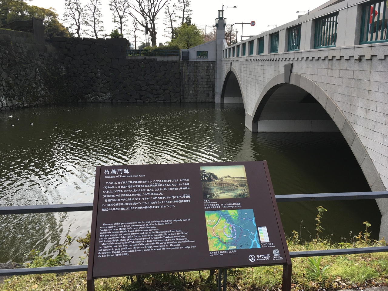 内濠の桔梗濠と蛤濠の間に架かっている橋です。最初に江戸城を築いた太田道灌の家紋が桔梗紋だったことから桔梗門の名前がついたようです。また別名内桜田門橋とも呼ばれます。個人的には皇居参観の際にこの橋を渡ったことがあります。