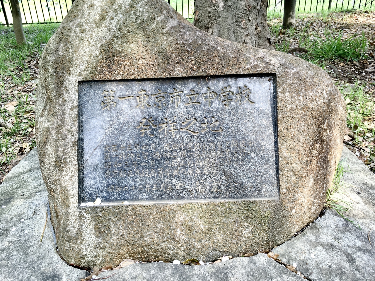 春の桜のお花見に皇居内濠を回って桜田門から千鳥ヶ淵までやってきました。ソメイヨシノは散りかけていましたが、もう少しで半蔵門というあたりにこの碑がありました。大正時代にこの辺りに中学校があったそうです。その後移転した現在の都立九段高校だそうです。