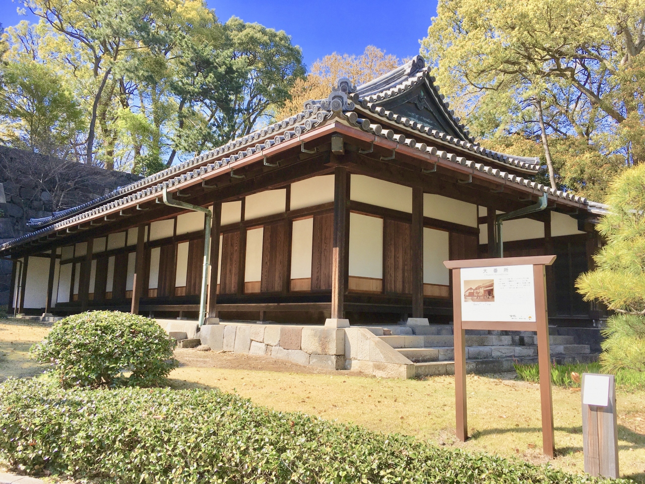 皇居東御苑にあります。江戸城の正門である大手門から本丸に入る際の検問所で、伊賀、甲賀、根来、黒田二十五騎組の4つの組が交替で勤務していたそうです。各組がそれぞれ100人ずつの鉄砲隊を組織していたことから百人番所と呼ばれていたそうです。すごい護りだなあと感じました。