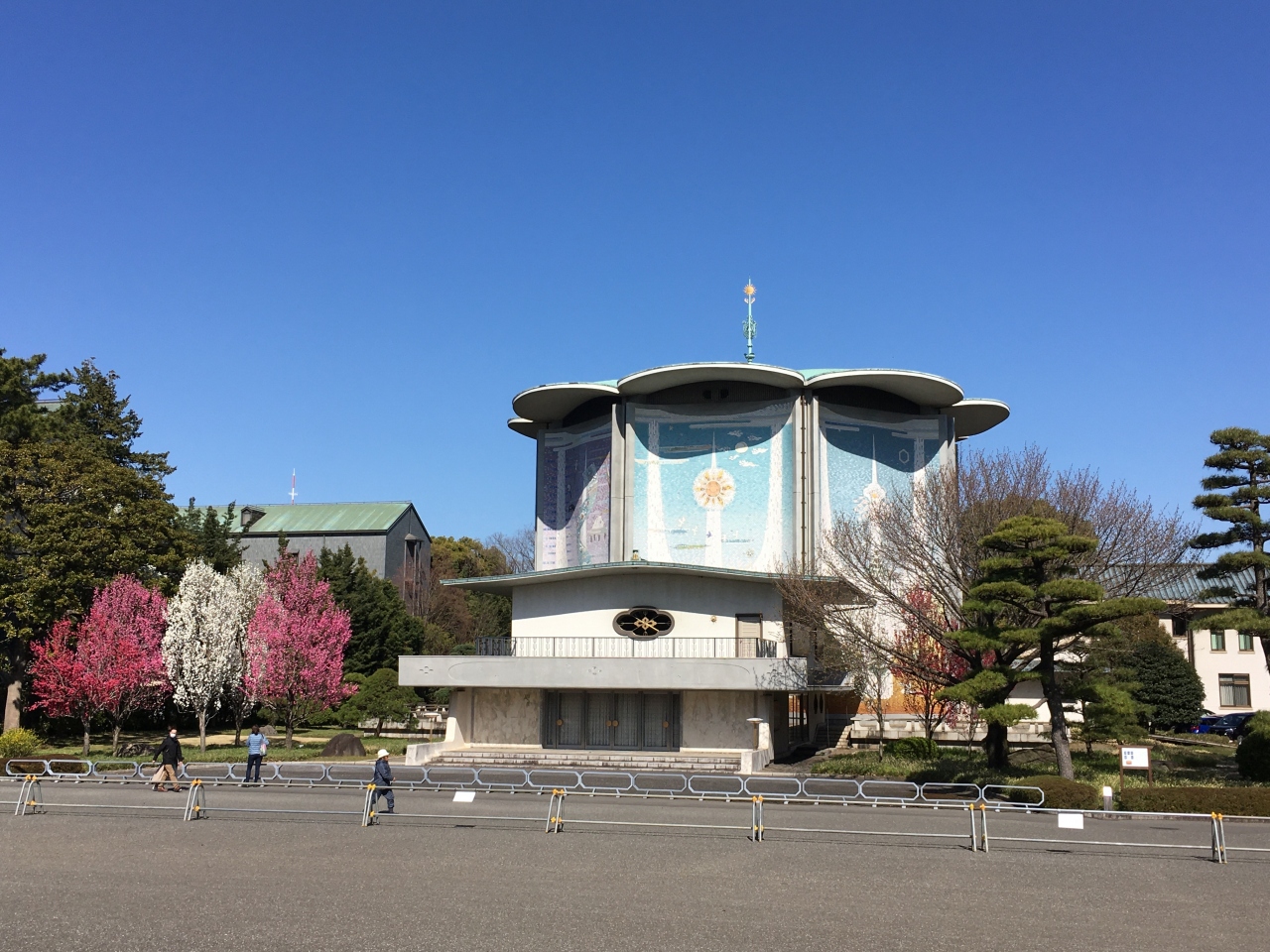 音楽好きの昭和天皇の皇后であられる香淳皇后様の還暦記念に建設された音楽ホールです。江戸城天守台の前にあり、テッセンの花弁をかたどった屋根と八面体の珍しい建物です。その前の木が綺麗に色づいていて、インスタ映えすると思いました。