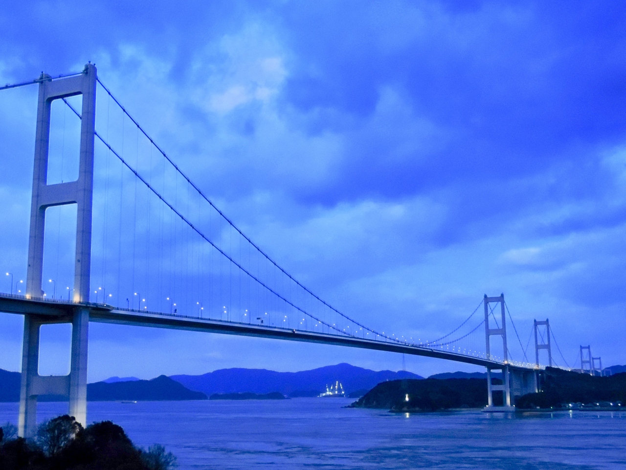 サンライズ糸山に宿泊し、部屋からバルコニーに出て来島海峡大橋の絶景を楽しんでいたところ、夕方になると、橋がライトアップされました。海に浮かぶ船も灯りをつけて通過していきました。残念ながら、写真が思うようには撮れませんでした。