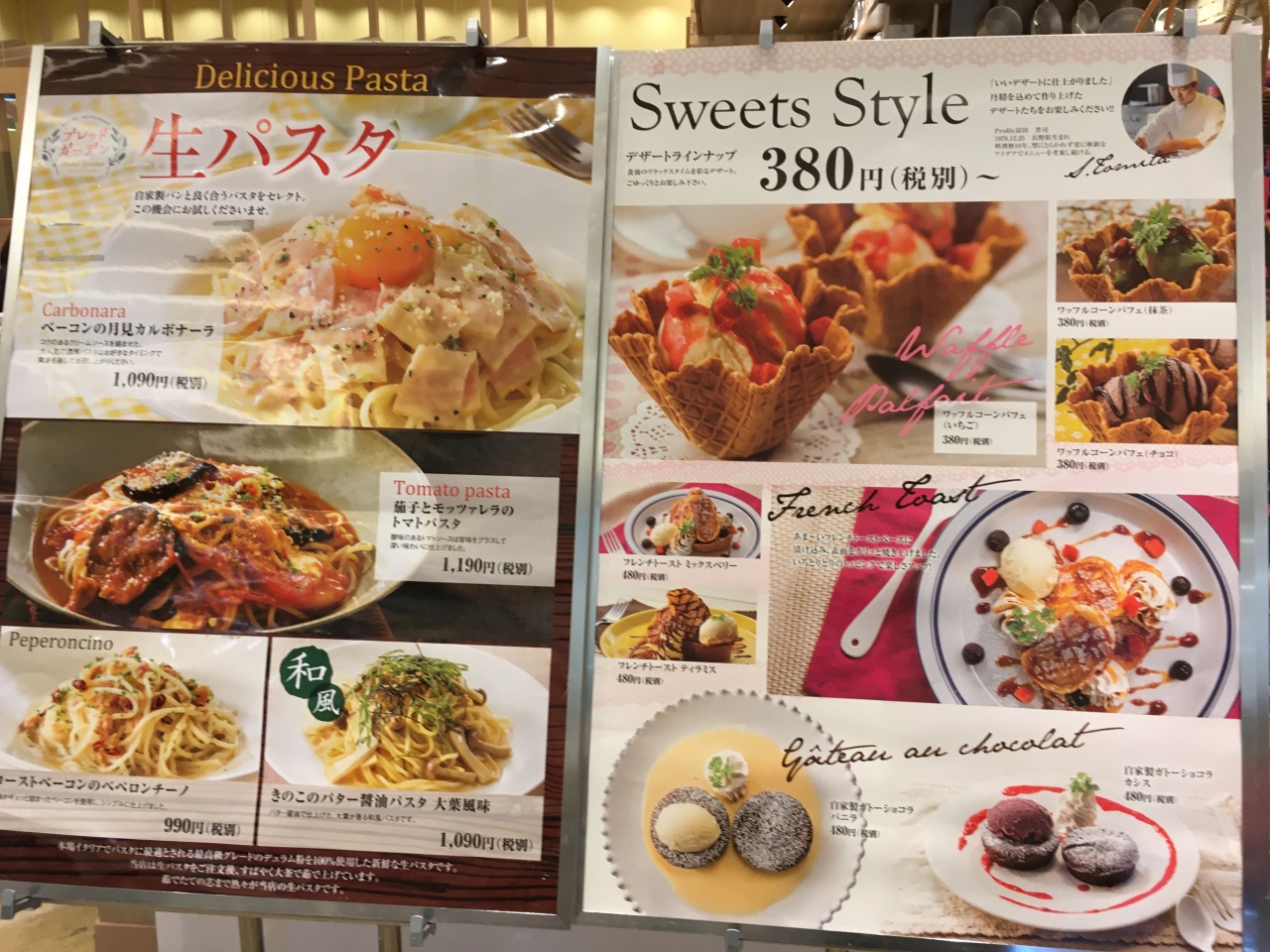 サンマルクグループのレストランで、ここは焼きたてのパンが食べ放題なのが魅力です。ハンバーグとかグラタンとか色々ありますが、今日行ったら、入り口には生パスタやスイーツ、ステーキなどのメニューが掲示されていた。