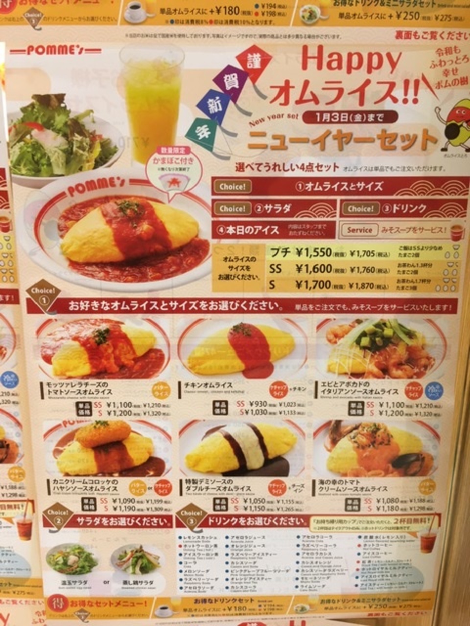 店頭のサンプルの並ぶガラスに、一面紙が貼ってあるので何かと思ったら、元日から3日までの3日間限定のお正月スペシャルメニューをやっていて、そのチラシが貼ってありました。オムライスが食べたくなるとここに来ます。色々なオムライスがあります。