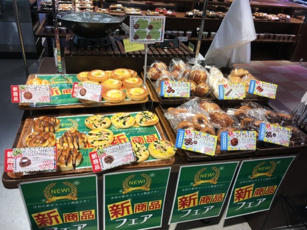 パン売り場の近くには、広いイートインスペースもできて、給水機もあります。焼き立てパンは、新商品も並んでいました。- 旅行時期