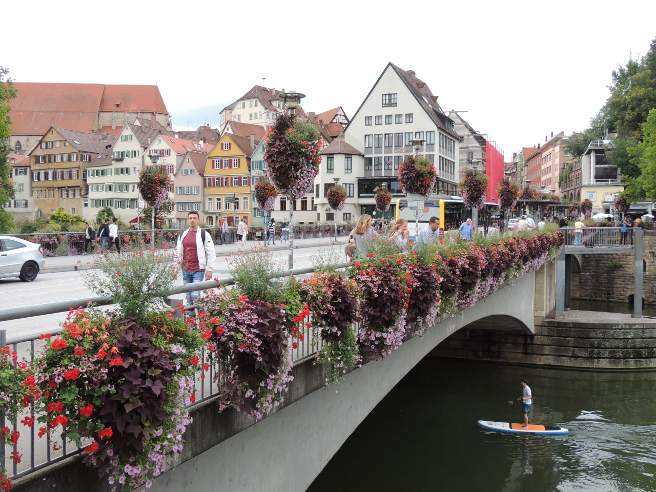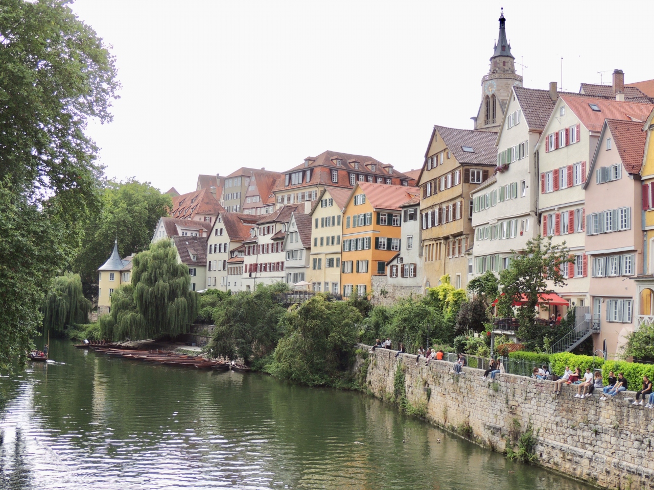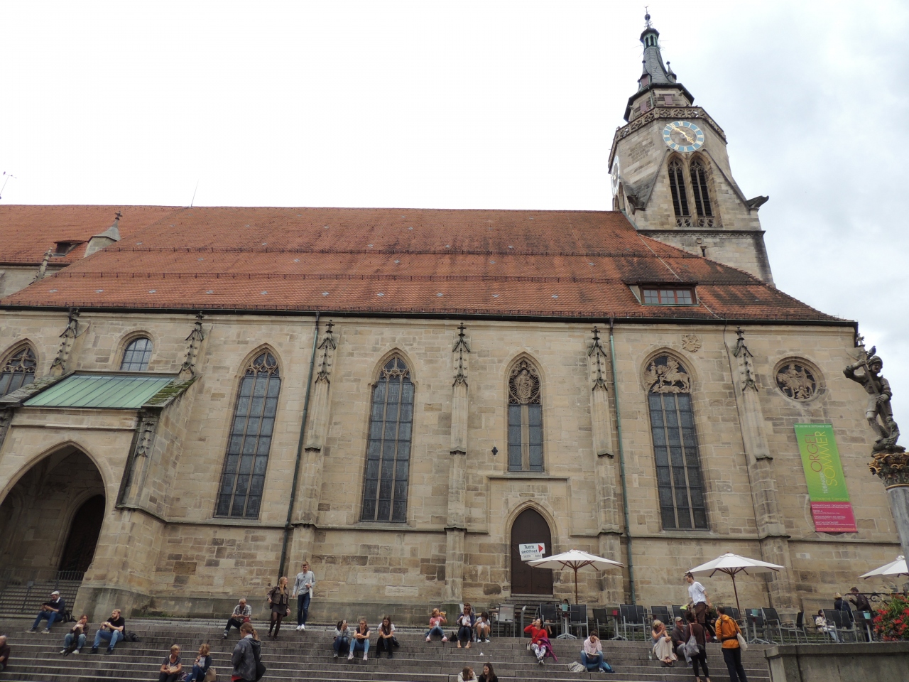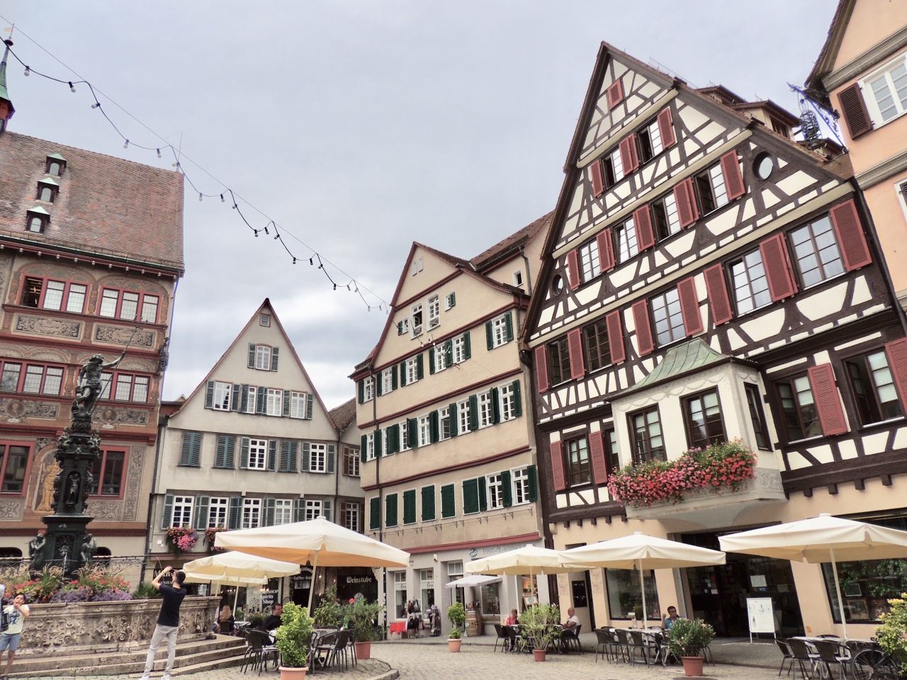 ドイツ人が選ぶ一番住んでみたい街として有名なここテュービンゲンの街の中心で、可愛い絵と時計の市庁舎とネプチューンの噴水があり、気骨組の建物が並んでいます。夏のバカンスのシーズンなので観光客の姿もありますが、団体客やアジア人の姿は皆無で心地よく観光できました。