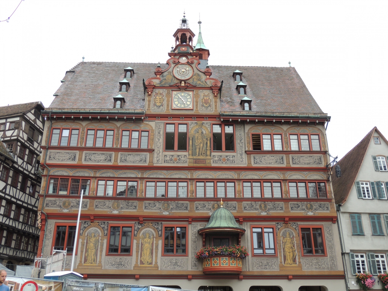 テュービンゲンの街の中心であるマルクト広場にあり、シュティフト教会からは歩いて3分、ホーエンテュービンゲン城も徒歩5分の距離にある。壁一面に描かれた絵と時計がドイツらしくメルヘンチックでとても素敵な庁舎です。