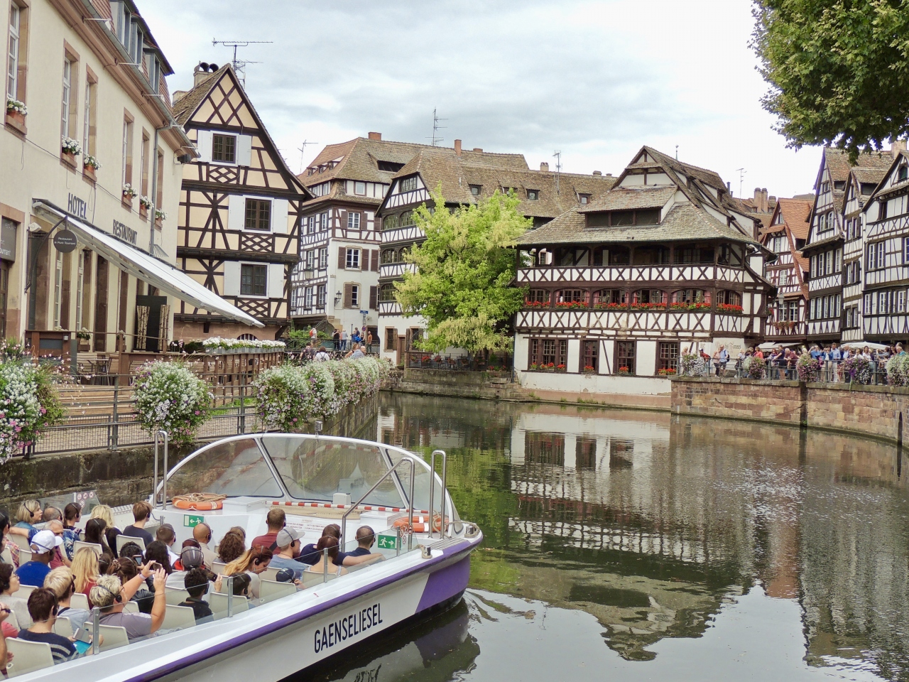 ストラスブールの駅を背にしてイル川に向かって歩いて橋を渡ると、白壁に黒い木骨組みの家々が並ぶ一帯が現れます。橋や家々が花で飾られ、とても美しい風景が楽しめます。イル川から遊覧船に乗って景色を楽しむこともできます。