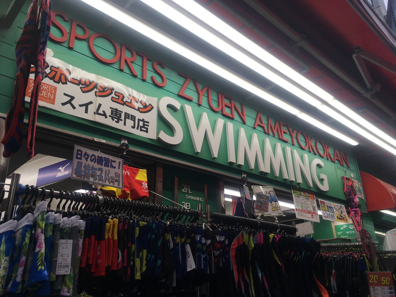小さな店です。水着専門店で、競泳などの選手達が見に着ける為に、耐久性が高い商品をラインナップしているので、一般のスポーツ品店に比べると、ちょっとお高い商品が多いと思います。2階の壁には、有名な選手達のサインが並んでいます。