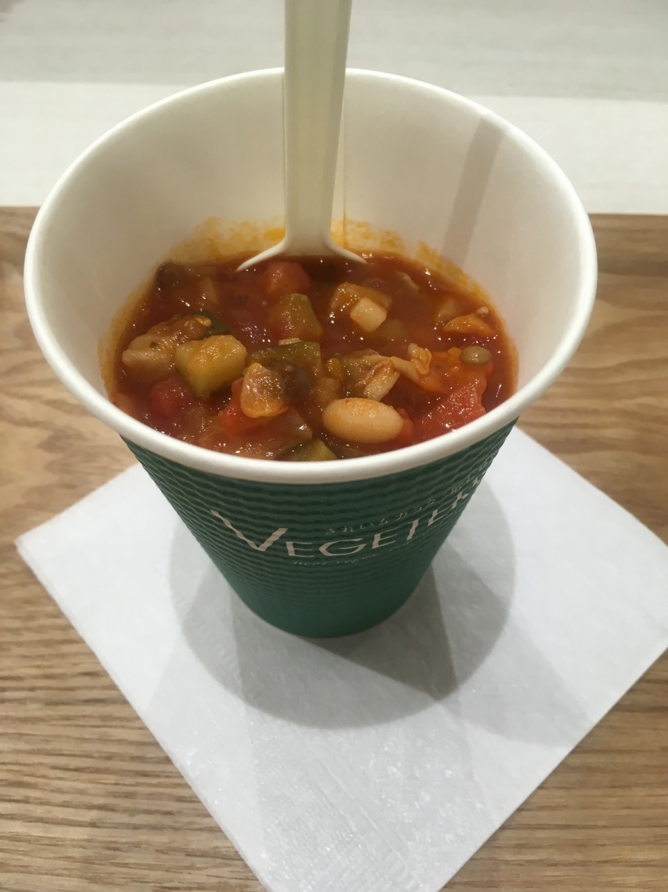 野菜サラダのお惣菜店がイートインコーナーを出しました。寒いけど野菜は食べたいなあと思いながら、スープストックを通り過ぎて見つけました。15品目のトマトスープを選びました。野菜と豆がたっぷり入っていて満足。作っているところを見ると、レトルトをレンチン。容器は紙コップでした。