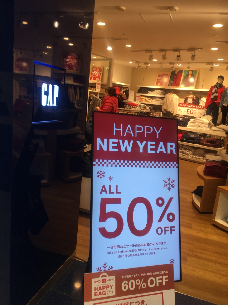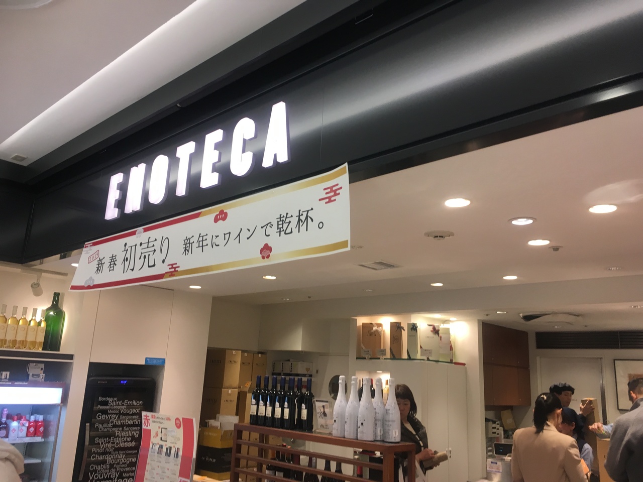 1月2日の初売りに行ったのですが、1階正面口ですごい福袋を見つけました。7万円で往復新幹線利用、加賀屋1泊ペア、日程限定ですが、相手がいたら最高です。また、ワインショップエノテカは赤ワイン1本3240円で1等が当たれば23760円相当がゲットできるのです。ワイン好きには魅力的で、大人の男女が袋の中を覗いていました。