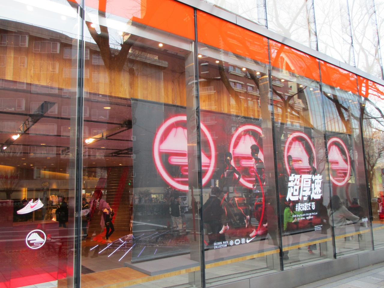 JR原宿駅から表参道を青山方向に歩いていると参道の左側の通りにあります。フラッグシップストアとしてはもう今年で10年目を迎えるそうです。通りに面してガラス張りで目を引くショップです。シューズやウェアなど種類も豊富です。