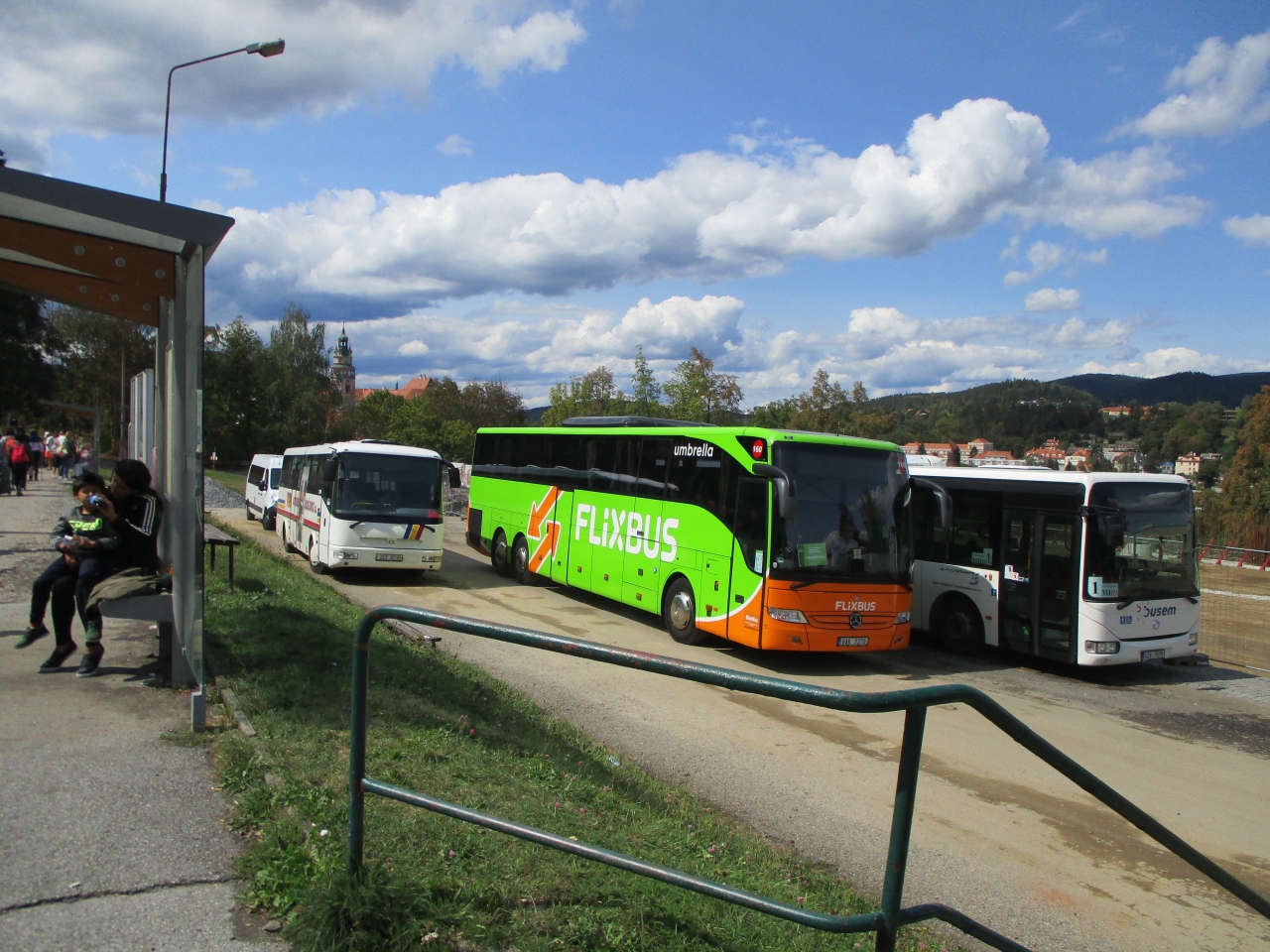 プラハからFLIXBUSを使ってチェスキークルムロフに移動しました。いよいよ到着と思って外を見ると舗装もされていない土ボコリの中に大型バスが何台も止まっていました。そんな中を皆大きなスーツケースを引いて歩いて街に入って行きました。