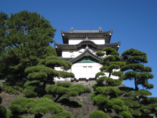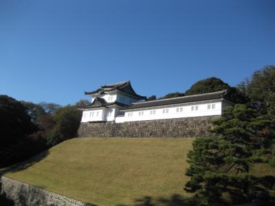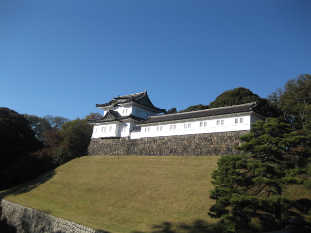 皇居一般参観に申し込み、窓明館を出発して係官の案内に従って進んでいたら見えてきました。江戸城の遺構としては最も古いもののうちの三重櫓だそうです。石垣の高さは15メートル、櫓の高さは16メートルだそうです。白壁がこの日の晴天によく生えました。
