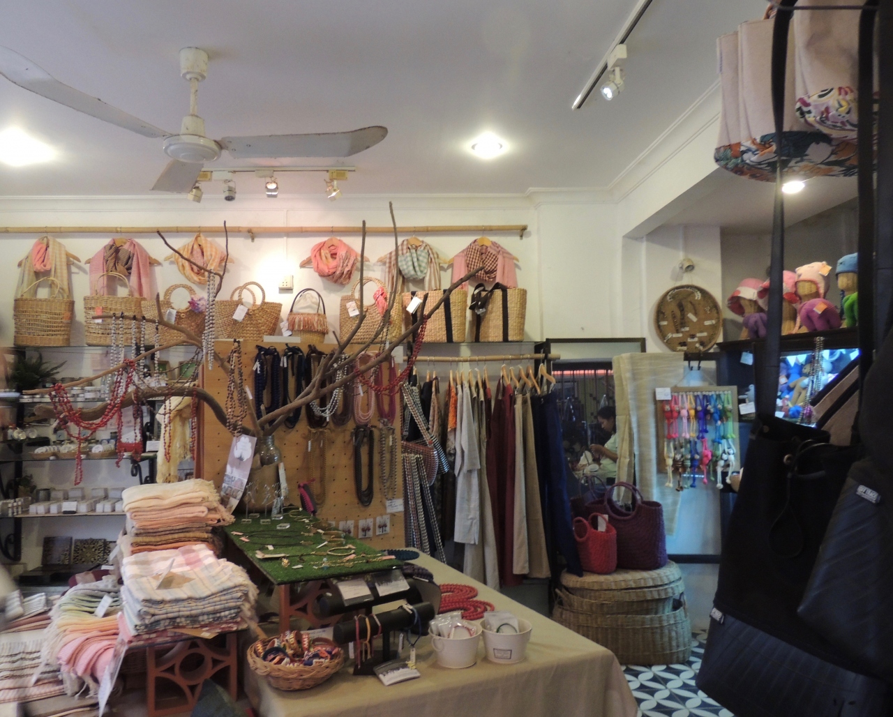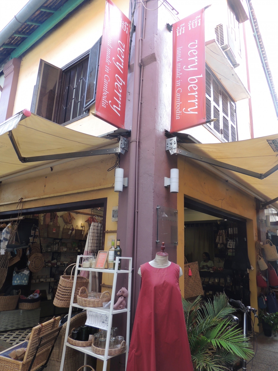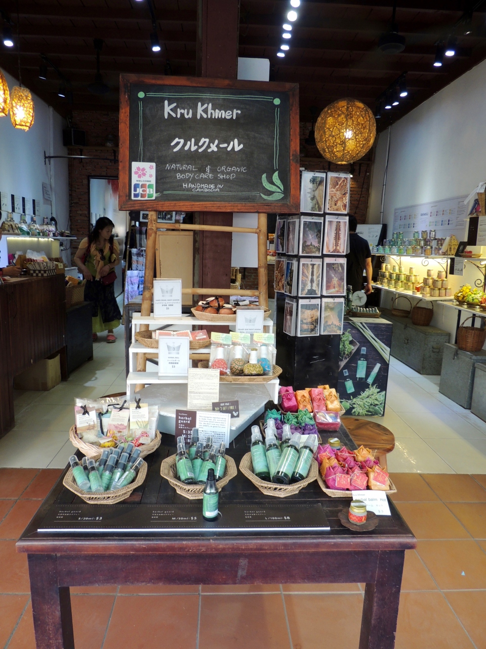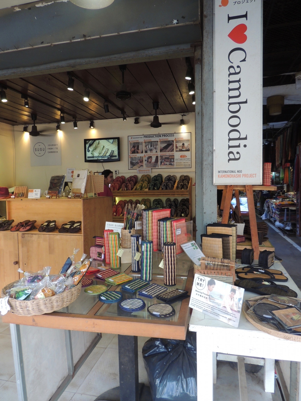 オールドマーケットの一番南側の通り沿いで西側にある。 I love cambodiaという看板が目印。い草でできたカラフルなグッズが並んでいる。日本人が経営していて、女性の自立支援が目的のNGOだそうです。