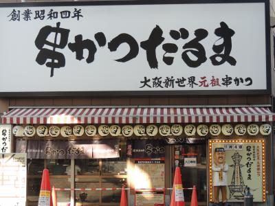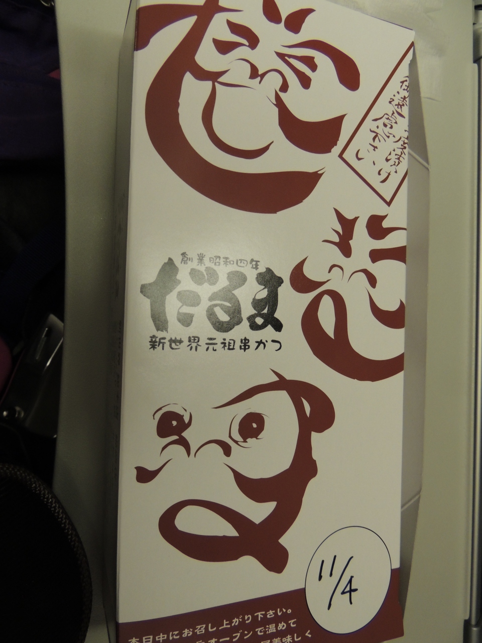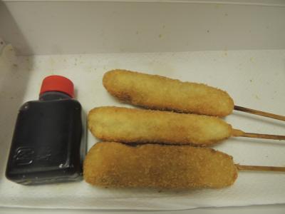 動物公園駅から通天閣まで歩く途中にこのだるまの総本店もあったが、とりあえず通天閣まで歩いて、目の前の通天閣店に入ったら、平日の午後なのに結構混んでいた。持ち帰りに包んでもらったら、ソースが別添えになっていた。