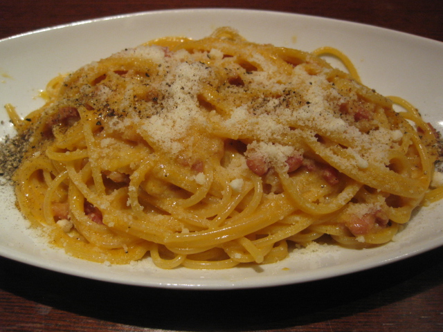 12時半とかに行ったら入り口に張り紙があり、この日は3度目の正直で12時前に入店。お一人様なのでカウンターに案内され、メニューの「本物のカルボナーラ」を注文。目の前にはいろいろな種類のリキュールのボトルが並んでいた。カルボナーラのソースはグッド。しかしパスタがアルデンテ以前の硬さだった。レジはなく、現金のみなので注意。