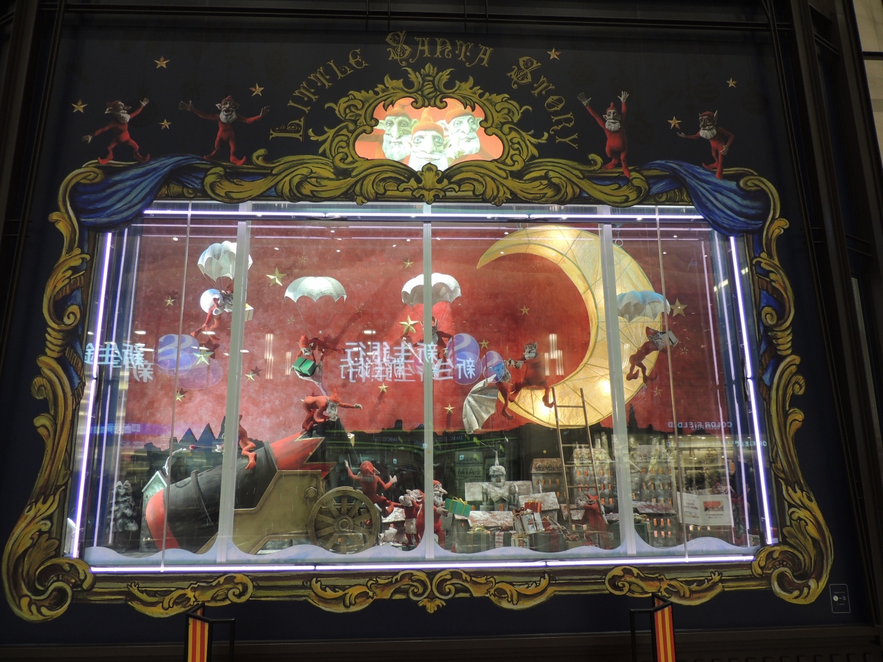 阪急電車を降りて地下鉄に乗り換える際に阪急百貨店入口左側の広い壁一面がいくつものクリスマスのディスプレーになっていて、これがとても見事な作り。親子連れ・おばあちゃんと孫連れの方々が皆記念写真を撮っていた。写真ではよくわからないが、サンタさんたちが動いていて、子供たちは大喜び。こんな豪華な造りだからいったいいくらかかっているのだろうかと一瞬よぎる大人にもワクワクする夢や幸せを運んでくれるデパートです。