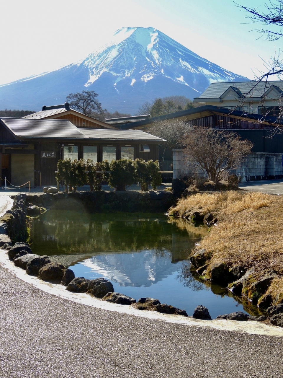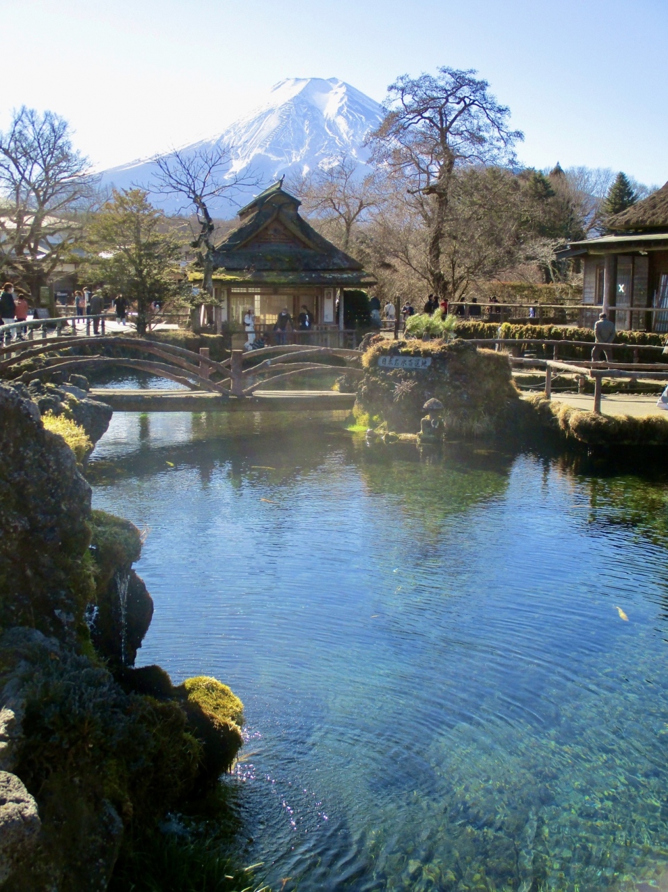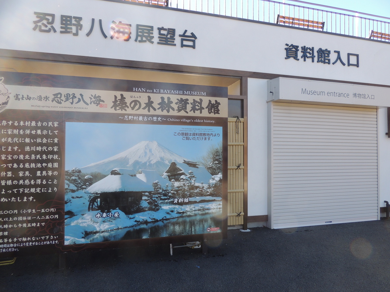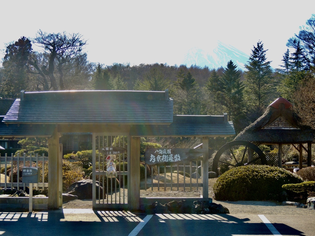 忍野八海大橋のすぐ近くにありました。御釜池のそばです。庭園の前は駐車場になっていて、バス停やトイレも近くにありました。広い日本庭園の中に藁葺き屋根の屋敷や水車などがあって、四季折々に楽しめる樹木が植えられていました。