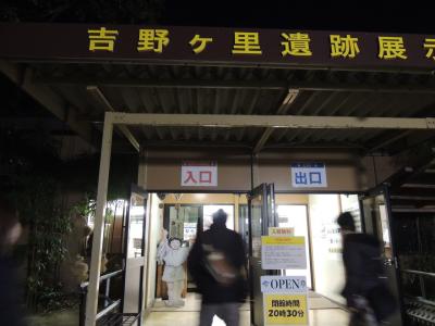 JRで吉野ヶ里公園まで行き、ここから田んぼの中を歩いて行きました。ライトアップを楽しんでから帰る際は、真っ暗闇の中を歩かなければならず、正直怖かったです。土曜日の夜だったので、家族連れが9割くらいでした。皆さんマイカーで来ていました。