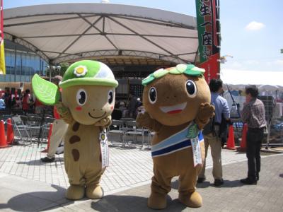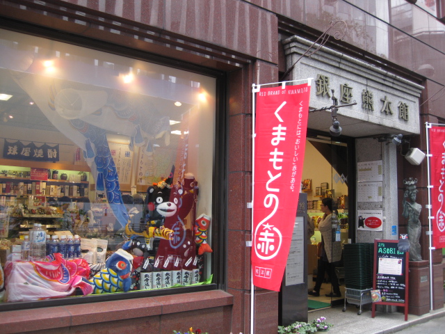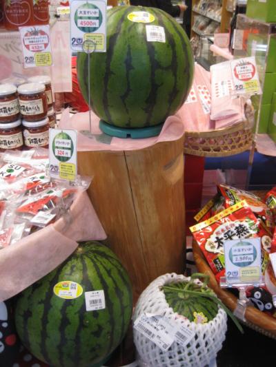 ソニービルのすぐ近く。店舗は小さいが、熊本産のおいしそうな物であふれている。狭い店舗の中で物色。トマトでできたパスタやお菓子やいろいろ。くまモンのボールペンと小さなお人形もお土産におすすめ。この日は店頭にスイカがおでまし。